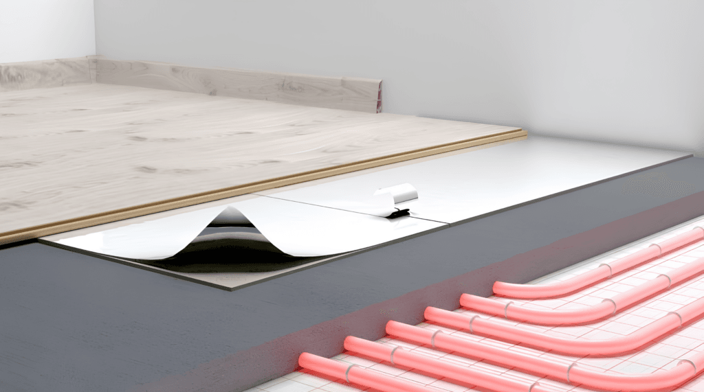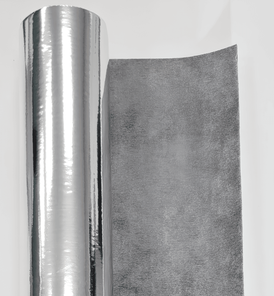 2 – Rozwijać podkład na przygotowanym podłożu, równoległymi i przylegającymi do siebie pasmami, metalizowaną warstwą paroizolacyjną do góry. Uszczelnić połączenia taśmą paroizolacyjną.