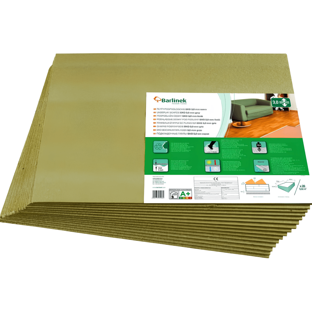Eko płyta podpodłogowa wykorzystywana jest jako podkład pod podłogi drewniane. Doskonale nadaje się jako podkład pod Deskę Barlinecką montowaną w systemie pływającym, który nie wymaga użycia kleju. Płyty eko pozwalają łatwo wyrównać nierówności podłoża, stanowią też dodatkową izolację akustyczną (świetnie nadają się do pomieszczeń, w których bawią się dzieci), termiczną. Poprzez podłożenie płyt eko pod drewniane deski podłogowe, można zniwelować przewyższenia wylewki (nie powinny one przekroczyć 3 mm na długości 2m), które mogłyby skutkować odkształceniami podłogi oraz jej skrzypieniem. Płyty eko nie zmieniają swoich właściwości z czasem, przez co będą z powodzeniem służyły przez długie lata.