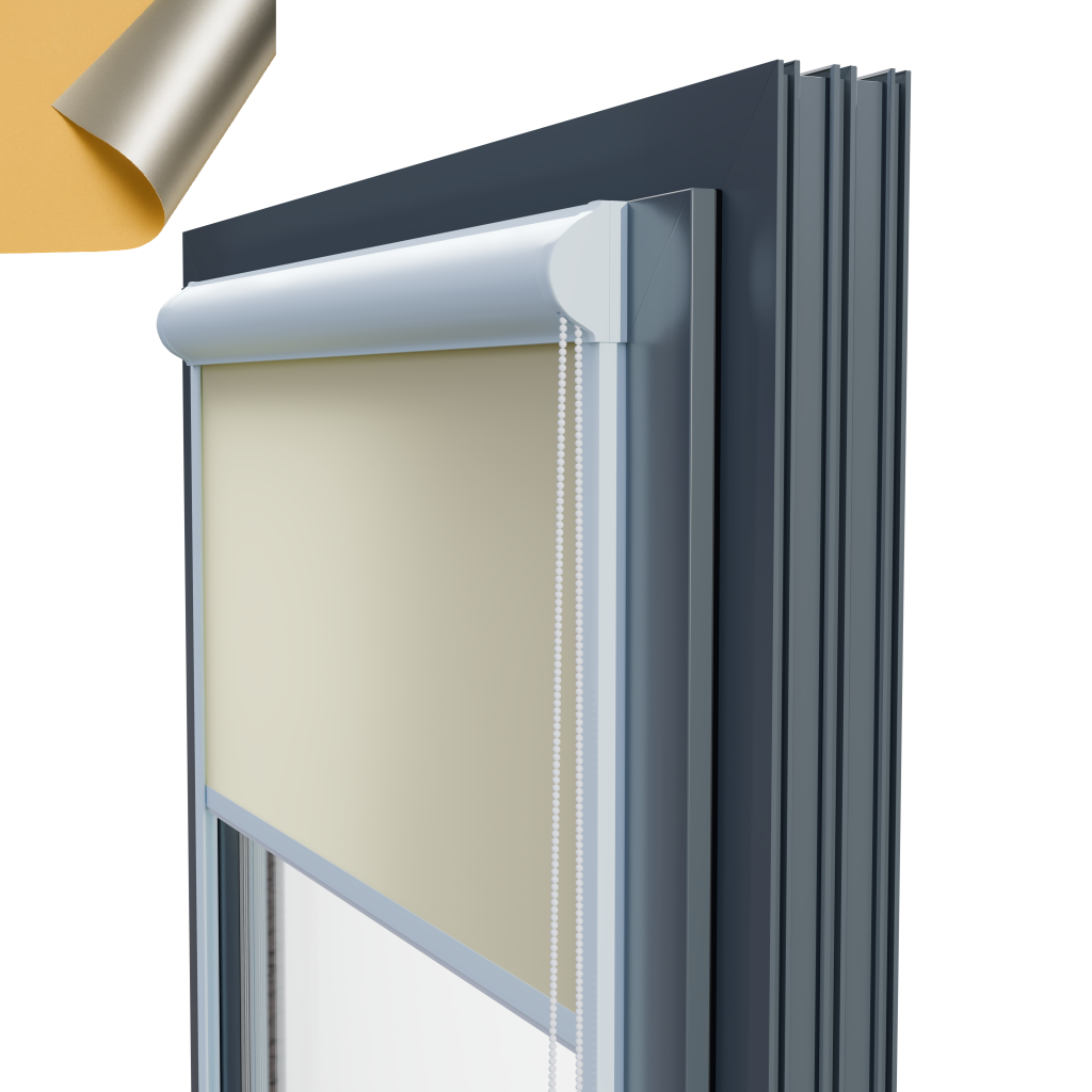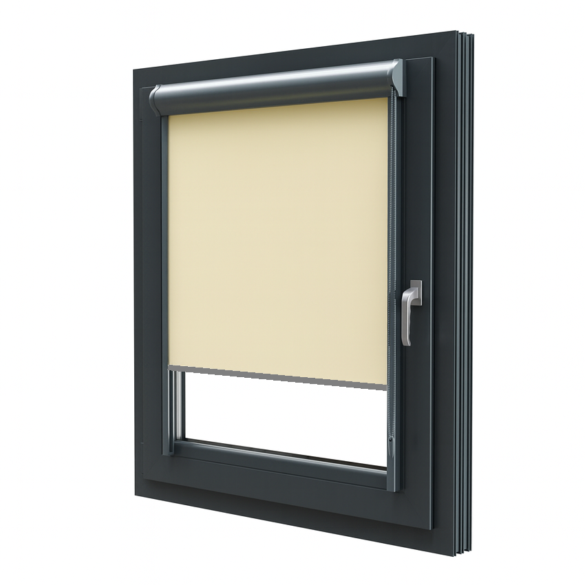 Roleta materiałowa termoizolująca i zaciemniająca w plastikowej kasecie z prowadnicami