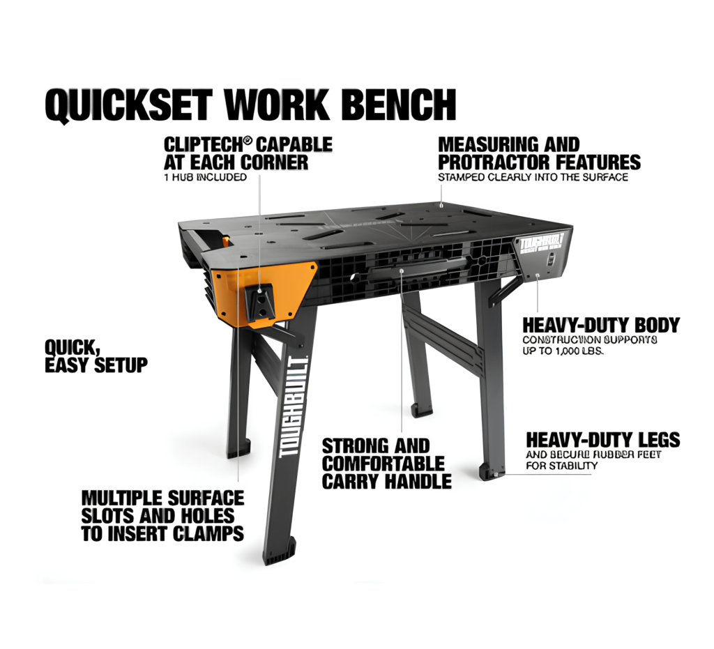 ToughBuilt® QuickSet Work Bench to solidna powierzchnia robocza, którą można ustawić w kilka sekund. Wystarczy nacisnąć przycisk zwalniający i pociągnąć uchwyt, aby rozłożyć nogi i uzyskać dużą powierzchnię roboczą w dowolnym miejscu. Solidne metalowe nogi wytrzymują do 1000 funtów. Duża powierzchnia robocza zapewnia szeroki zakres zastosowań: świetnie nadaje się do cięcia, wiercenia, zaciskania i wielu innych czynności. Jest kompatybilny z szeroką gamą kieszeni ClipTech firmy ToughBuilt, zapewniając doskonałą organizację narzędzi. Natychmiastowe przypinanie i odpinanie kieszeni i narzędzi, aby każda praca była zorganizowana i wydajna. Od warsztatu, przez ciężarówkę, po miejsce pracy, ten stół roboczy jest łatwy do transportu, gdziekolwiek musisz się udać.